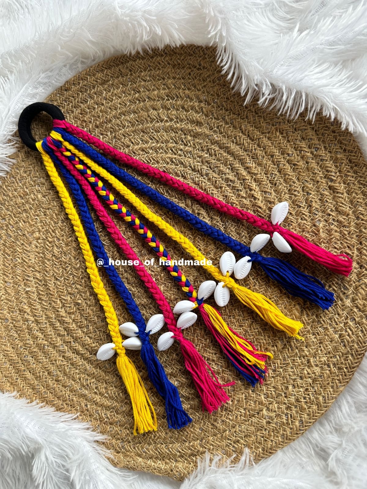 Bring a touch of earthy elegance to your festive look with our Handmade Boho Hair String with Cowrie Shells. Designed with colorful braided threads and adorned with natural shells, this accessory blends traditional craftsmanship with coastal bohemian vibes.