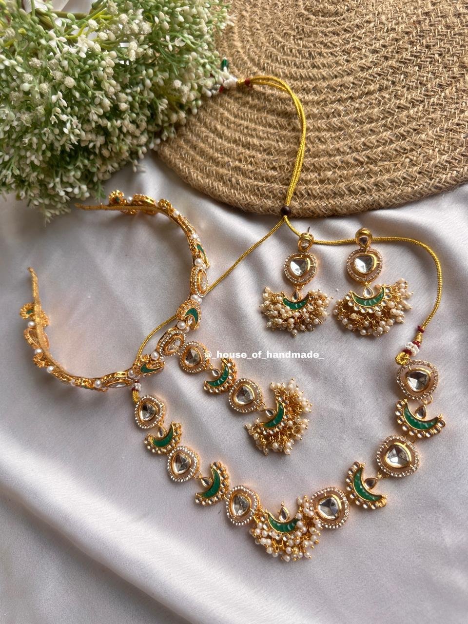 Handmade Green Bridal Hairband Tika Necklace Earrings Set