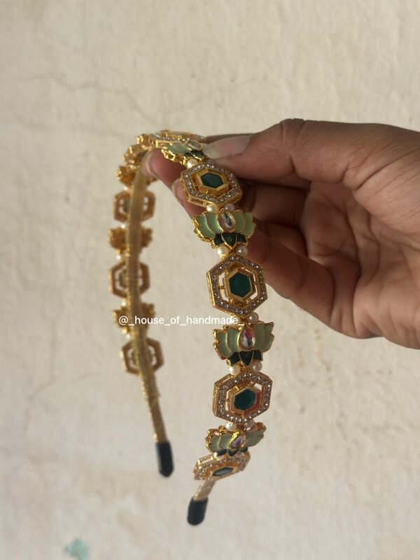 Celebrate traditional elegance with this exquisitely handcrafted Green Lotus Kundan Headband, made for women who adore detailed Indian craftsmanship. This beautiful piece features hexagonal kundan stones framed with shimmering embellishments, and stunning green enamel lotus motifs that symbolize purity and grace.