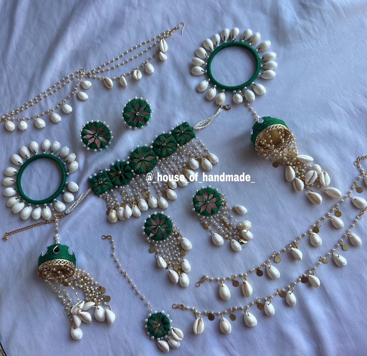 Embrace elegance and tradition with this Green Shell Pearl Jewelry Set. The stunning combination of deep green embroidery, natural shell embellishments, and delicate pearl strings creates a harmonious blend of style and heritage.