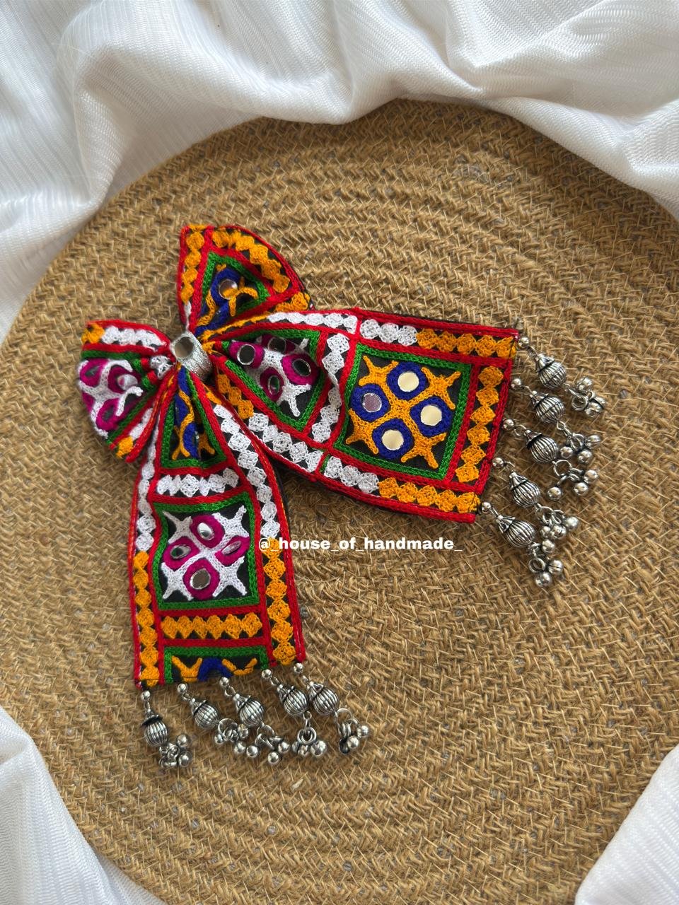 Celebrate tradition with this handmade embroidered bow brooch with ghungroo drops, a statement accessory crafted with love and detail. Designed with vibrant embroidery, mirror work accents, and dangling silver ghungroos, it adds both movement and elegance to your look.