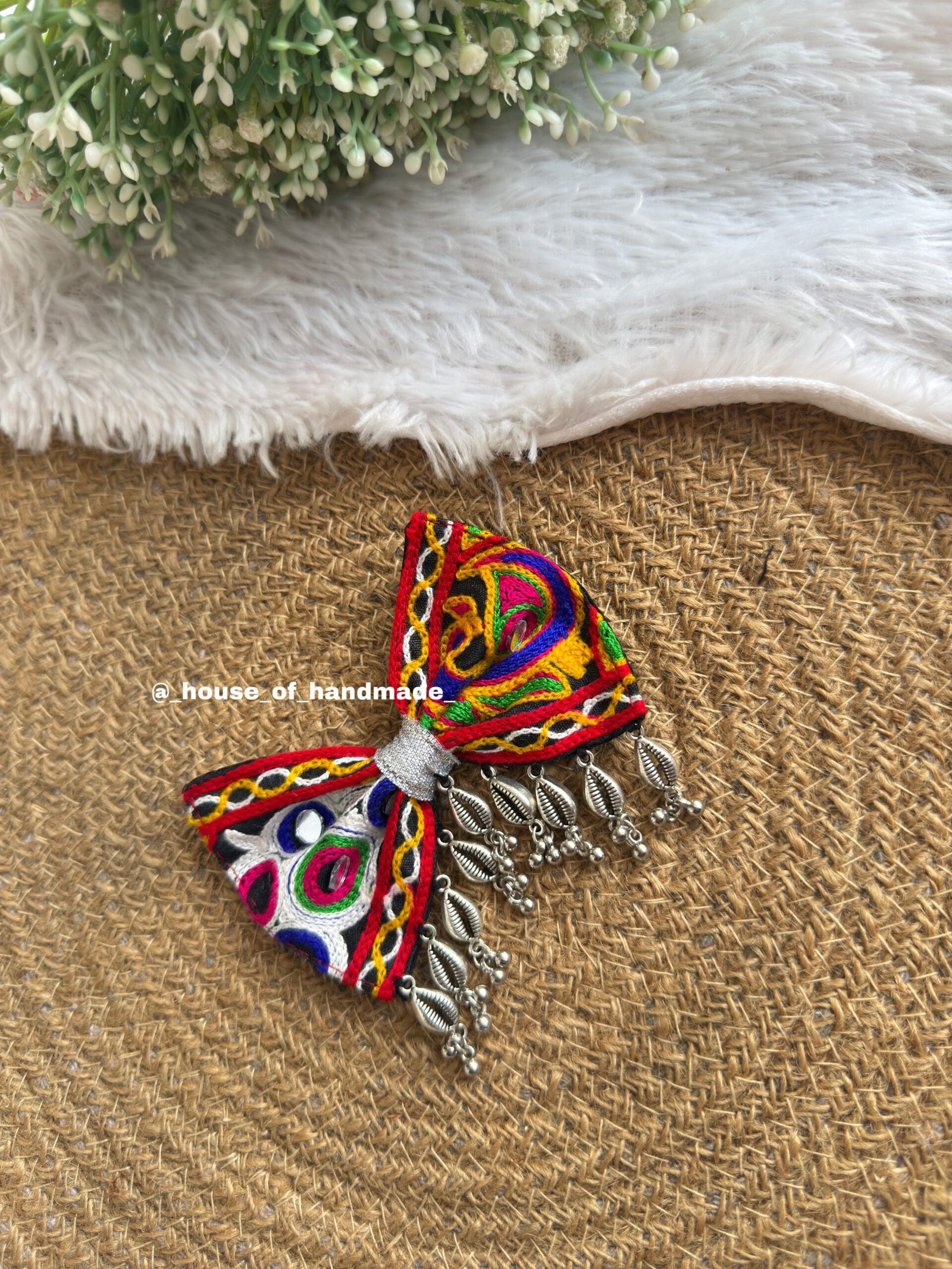 Handmade Black & Yellow Embroidered Bow Brooch with Pastel Mirror Work and Ghungroo