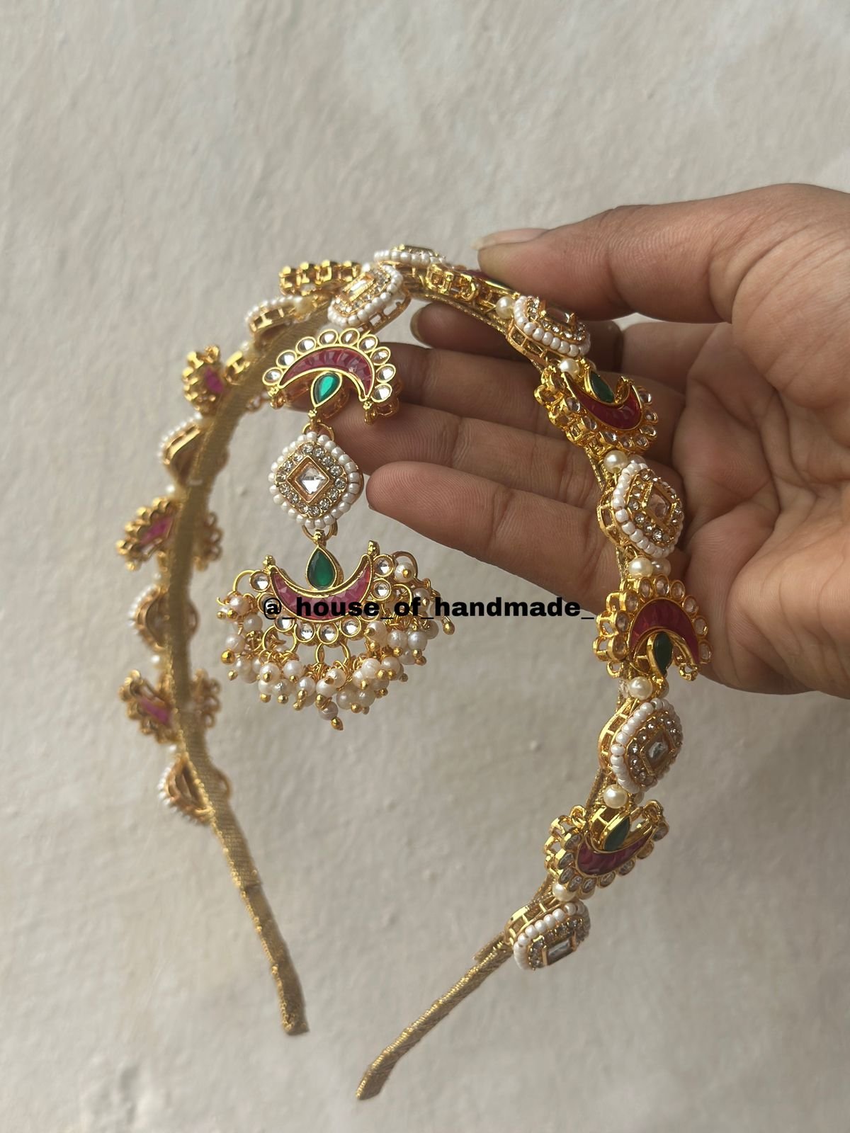 Make a bold and elegant statement with this Red-Green Crescent Kundan Hairband, featuring a unique hanging tikka centerpiece. This traditional yet trendy hair accessory is handcrafted with alternating crescent-shaped kundan motifs, square kundan stones, and pearl clusters on a golden base.