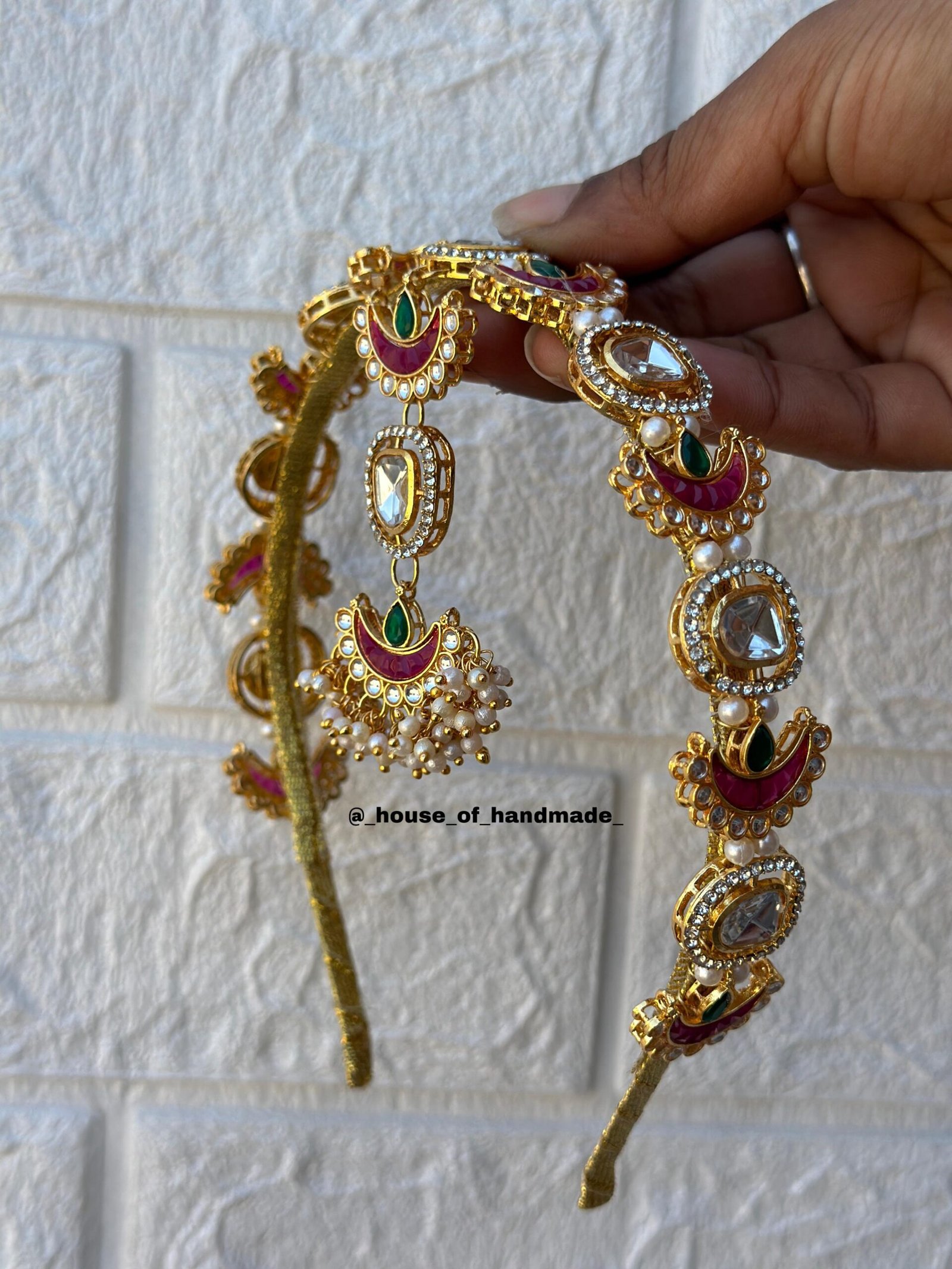 Its bold yet graceful design features a hanging pearl cluster centerpiece that enhances the charm of bridal and festive attire. Perfectly blending tradition with contemporary style, this hairband is a versatile accessory that pairs beautifully with sarees, lehengas, gowns, and Indo-western outfits.