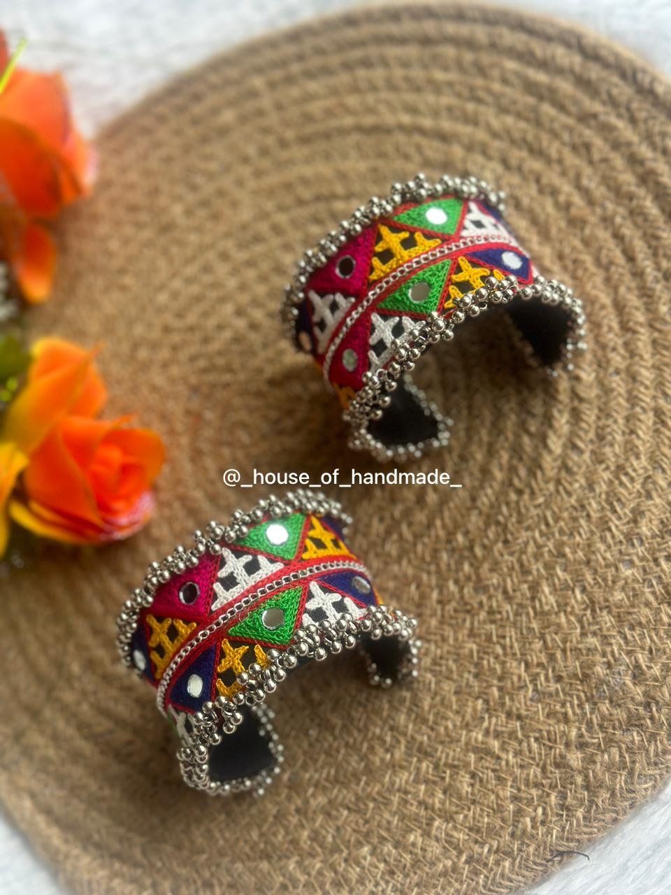 Elevate your festive wardrobe with these Handcrafted Tribal Embroidered Cuff Bangles — a celebration of culture, color, and craftsmanship. These cuffs feature intricate multicolor threadwork in geometric tribal patterns, accented with mirror detailing that reflects the spirit of traditional Indian folk art.