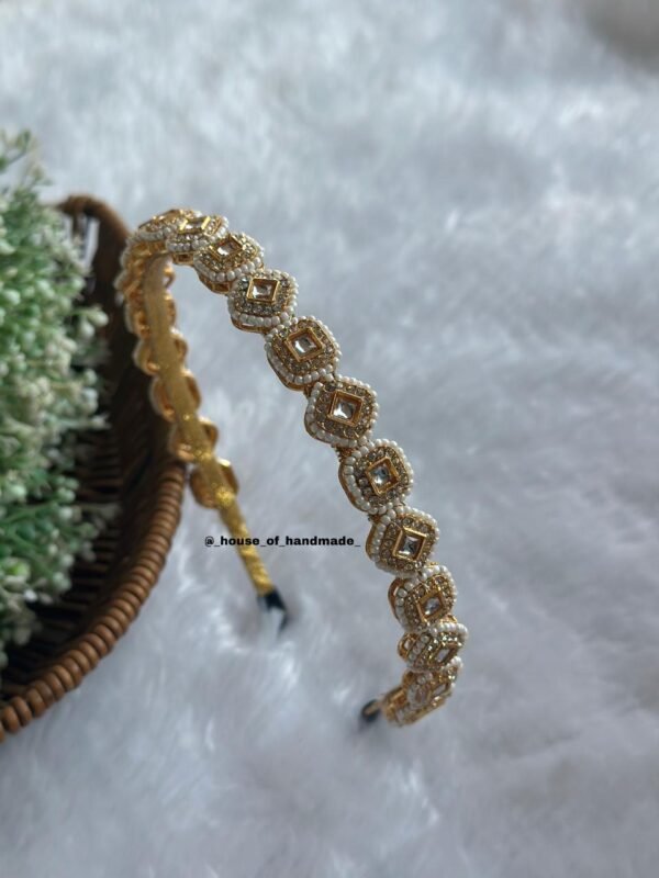 Grace your hairstyle with this White Kundan & Pearl Hairband, designed to add a touch of sophistication and tradition to your ensemble. This handcrafted piece features a series of square kundan motifs, surrounded by delicate pearl embellishments and finished with a luxurious gold base.